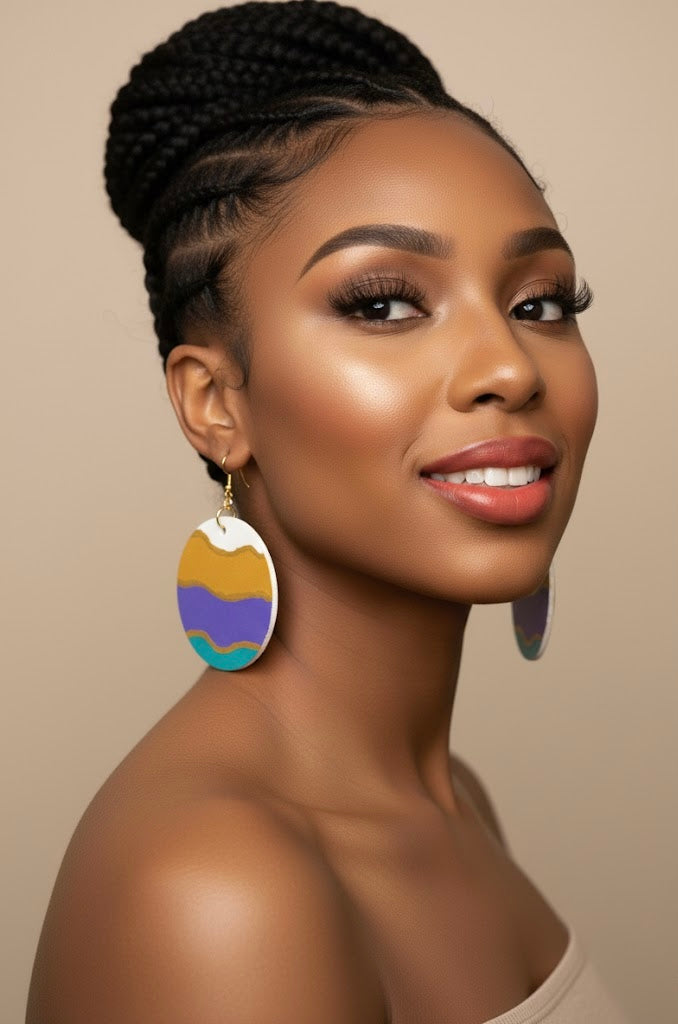 Turn heads and spark conversations with these vibrant, hand-painted statement earrings! Designed in a playful round shape, each earring bursts with layers of golden amber, royal purple, and aqua blue, all outlined with shimmering accents that mimic the rhythm of rolling waves.Lightweight yet full of personality, they’re perfect for elevating any outfit - from casual brunch looks to night-out glam.