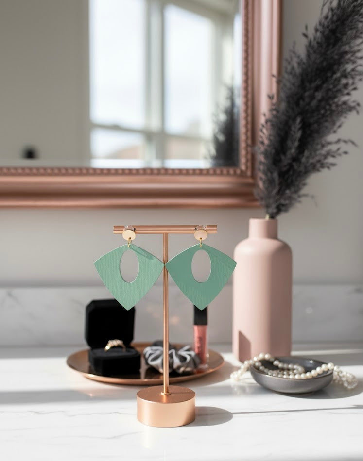 Add a touch of natural elegance to your accessory collection with these eye-catching wooden statement earrings. Featuring a soothing light mint matte finish, the modern geometric shape is perfectly balanced for a standout look.